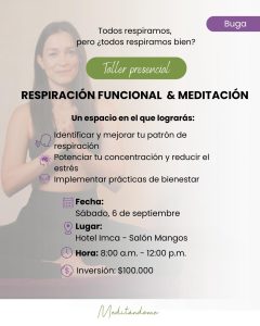En nuestro taller de respiración funcional y meditación, lograrás identificar y mejorar tu patrón de respiración, potenciar tu concentración y reducir el estrés, implementar prácticas de bienestar y aprender a regularte a través de tu respiración. Trae tu mat de yoga, manta o colchoneta, cojín de meditación o almohada pequeña, libreta y lapicero para escribir todo lo que descubrirás de ti. Te esperamos!